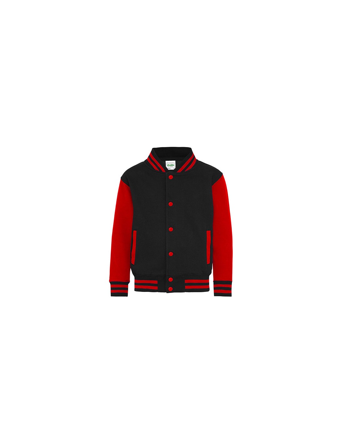 Modèle A-JH043J Kids Varsity Jacket Just Hoods : molleton brossé 330g avec contraste corps/manches style varsity.